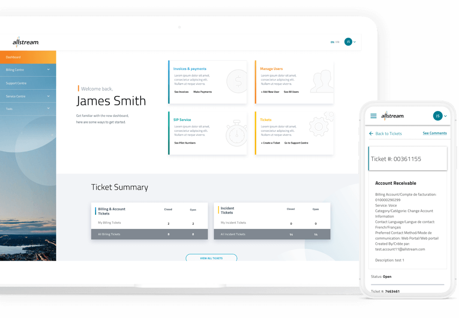 As Allstream's partner, we helped plan the consolidation of both portals, designed a modern interface, built a bilingual front-end in Angular.js and integrated several APIs with the Java back-end for a seamless merger. A dedicated team of developers continues to work with Allstream, releasing new features for customers and admin.